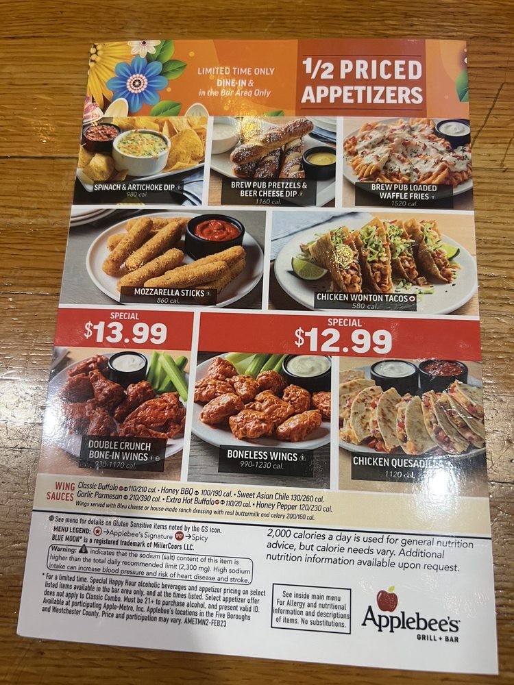 Applebee's Grill + Bar, located in New York, offers a diverse menu with options ranging from steaks & ribs to signature cocktails and appetizers. The restaurant provides various amenities such as delivery, takeout, vegan and vegetarian options, wheelchair accessibility, and more. The atmosphere is described as friendly, with moderate noise levels and good for groups or kids. Customers have praised the prompt and attentive service, with positive reviews highlighting the delicious food and excellent value. With offerings like the Applebee's Riblets Plate, Blue Hawaiian Long Island Iced Tea, and Boneless Wings, Applebee's provides a satisfying dining experience for guests. Whether you're looking for a casual meal or a place for happy hour specials, Applebee's Grill + Bar aims to please with its diverse menu and welcoming ambiance.